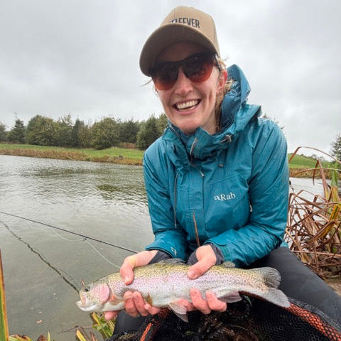 Katie, Chasing Salmon in style! Wearing the Fever Trucker Cap